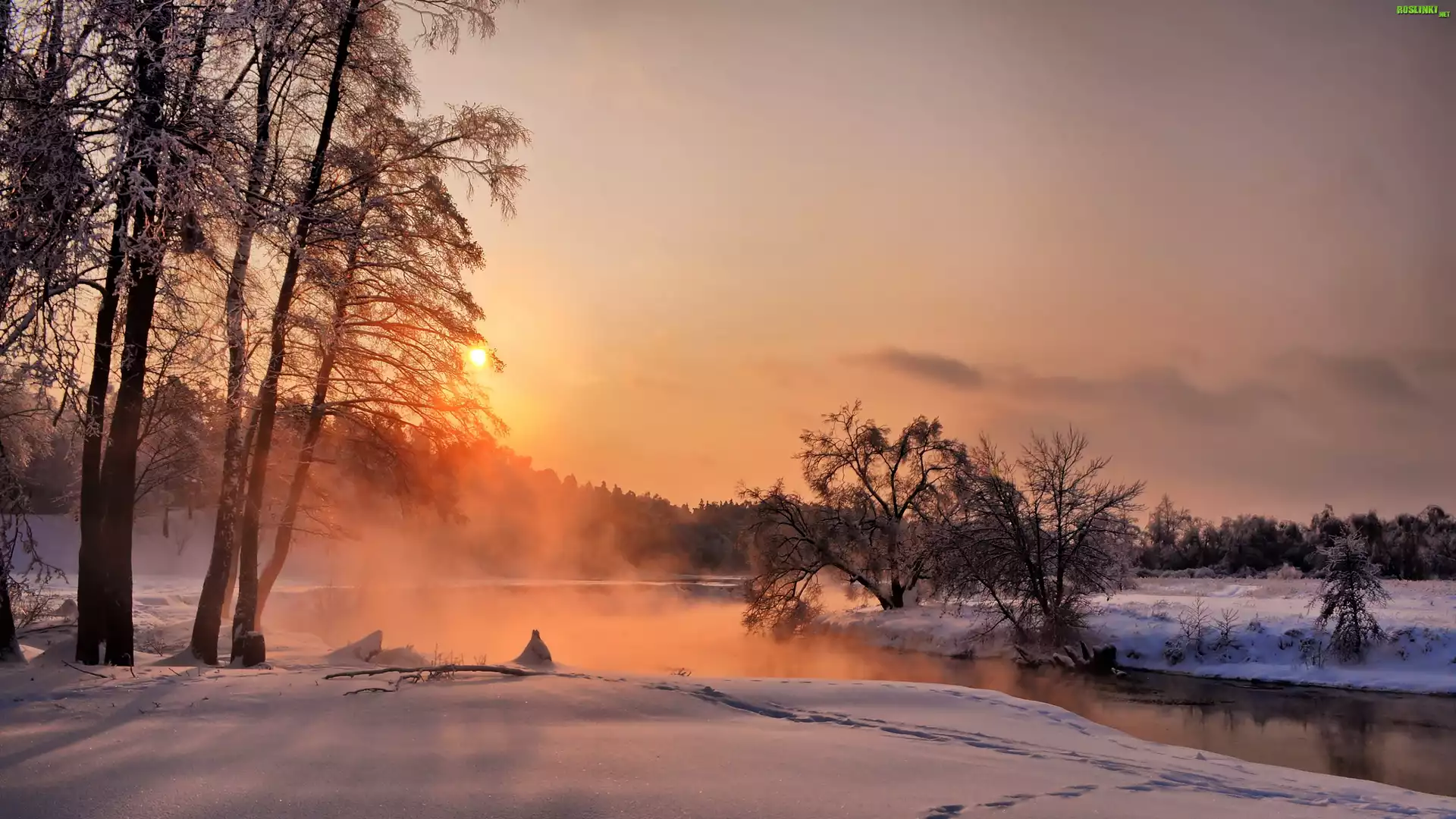Rośliny: Zima, Świt, Las, Rzeka, Drzewa, Mgła