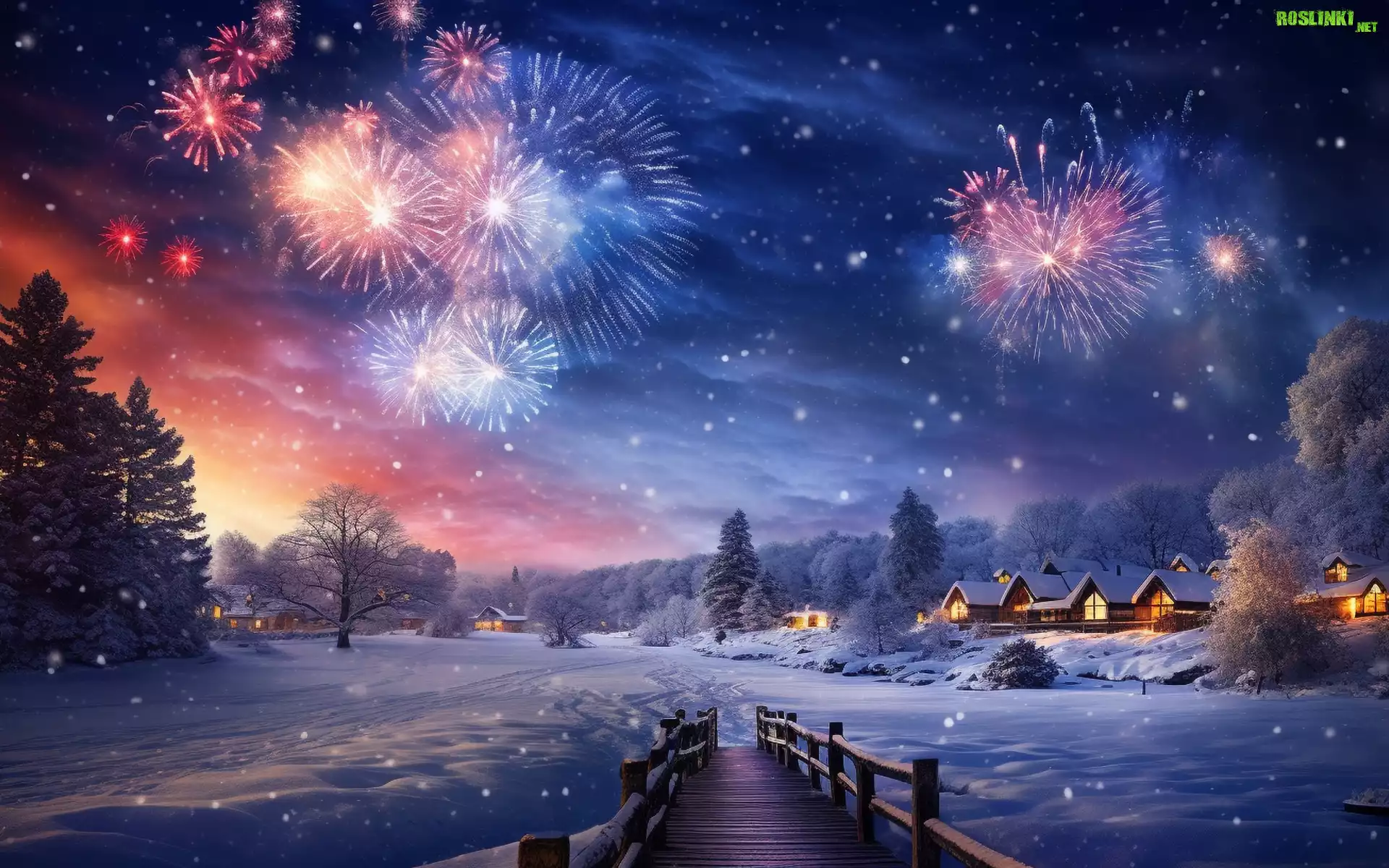Rośliny: Zima, Noc, Domy, Śnieg, Fajerwerki, Most, Drzewa, Nowy Rok