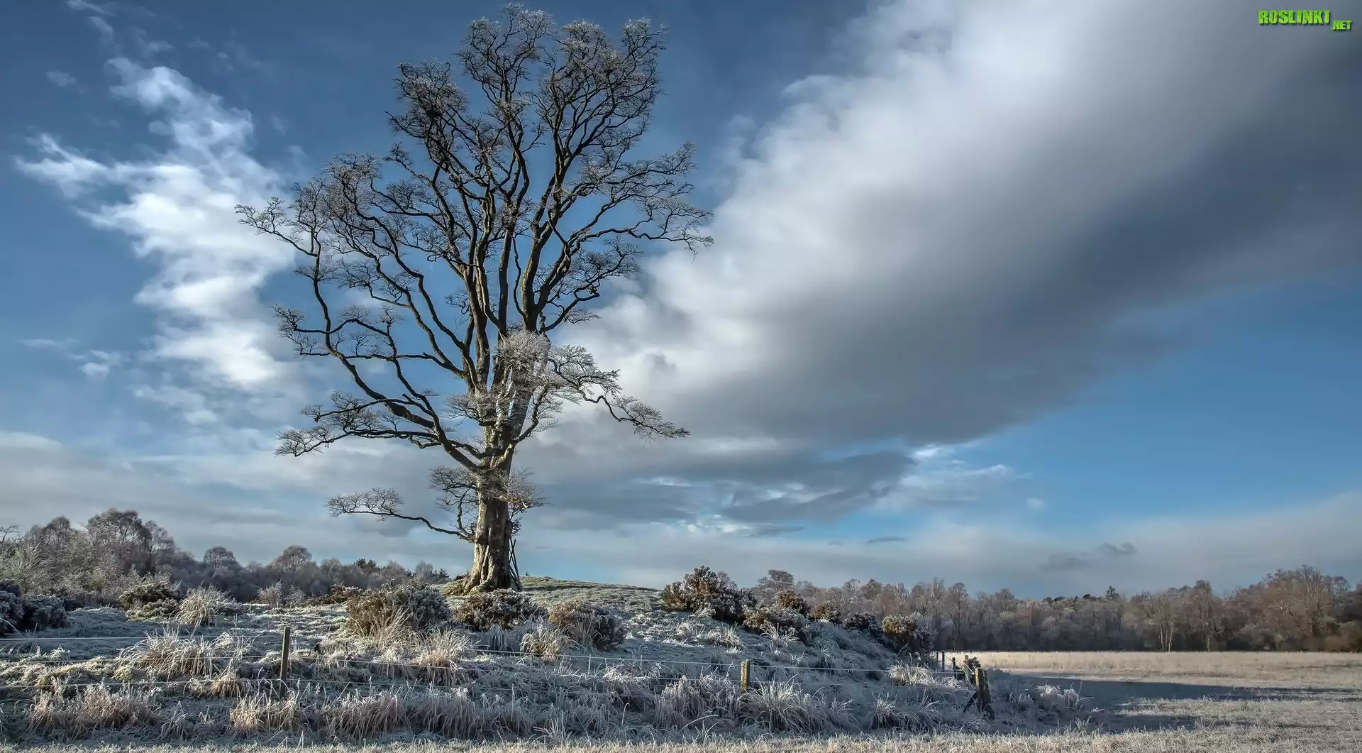 Rośliny: Zima, Pole, Oszronione, Drzewa, Trawa