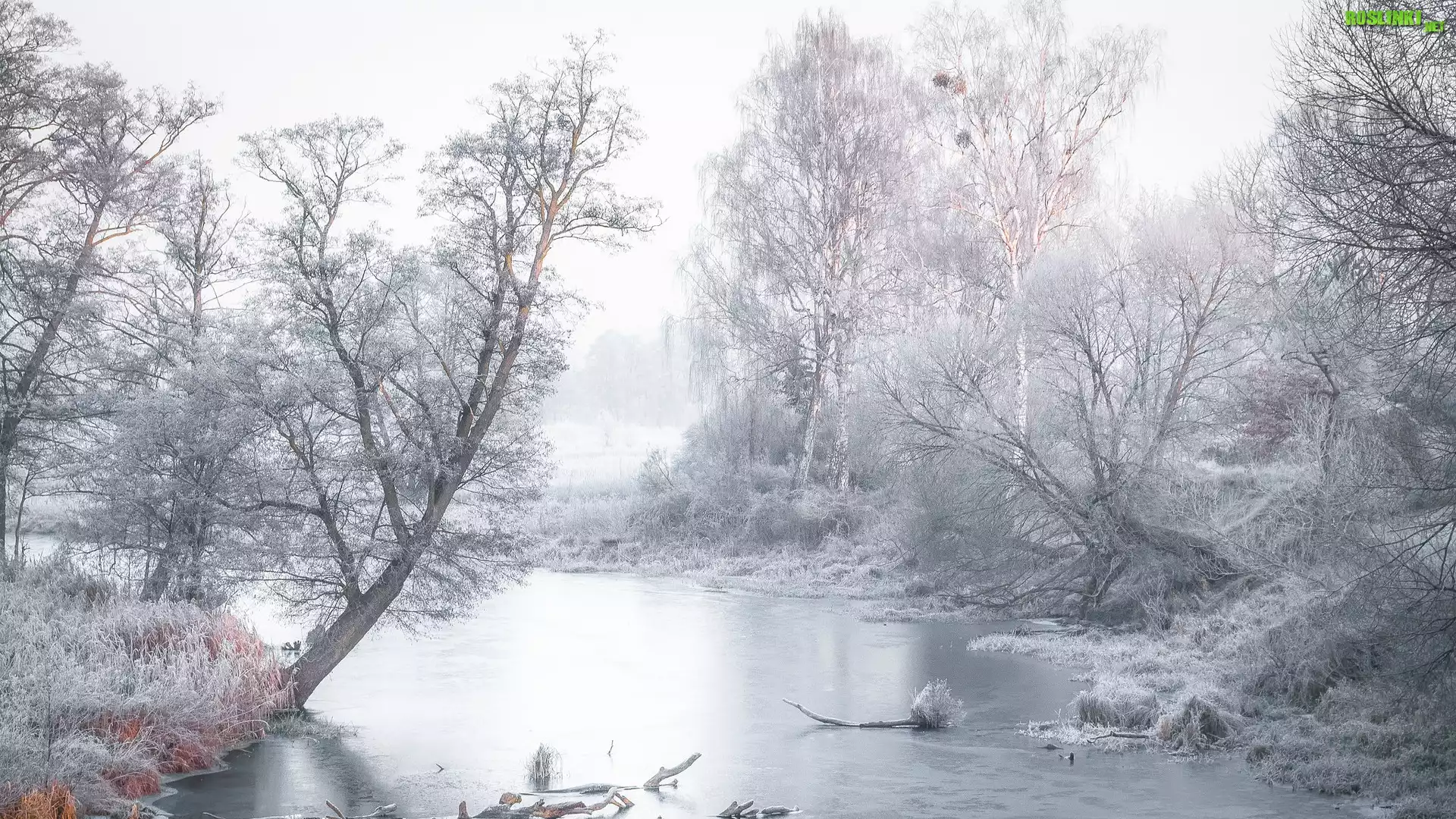 Rośliny: Zima, Rzeka, Oszronione, Drzewa, Trawy