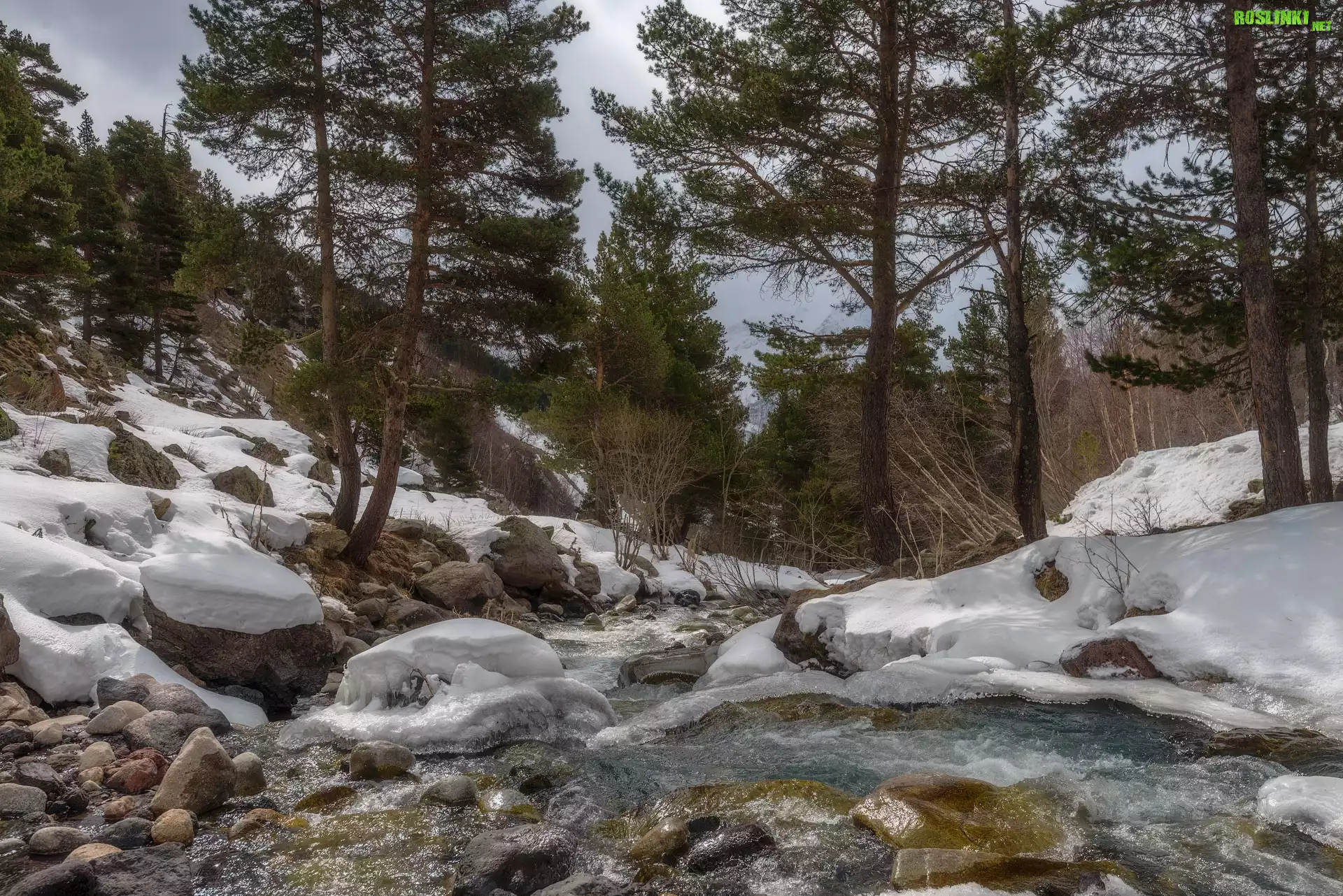 Rośliny: Drzewa, Las, Potok, Rzeka, Kamienie, Zima, Śnieg, Wąwóz Terskol, Kabardo-Bałkaria, Rosja