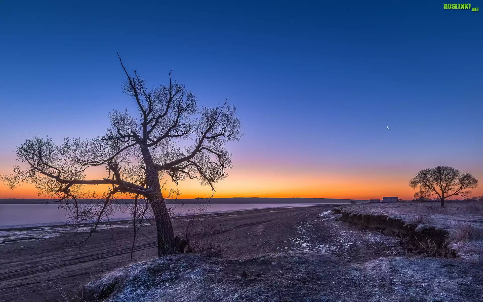Rośliny: Zima, Zachód Słońca, Pola, Drzewa, Droga