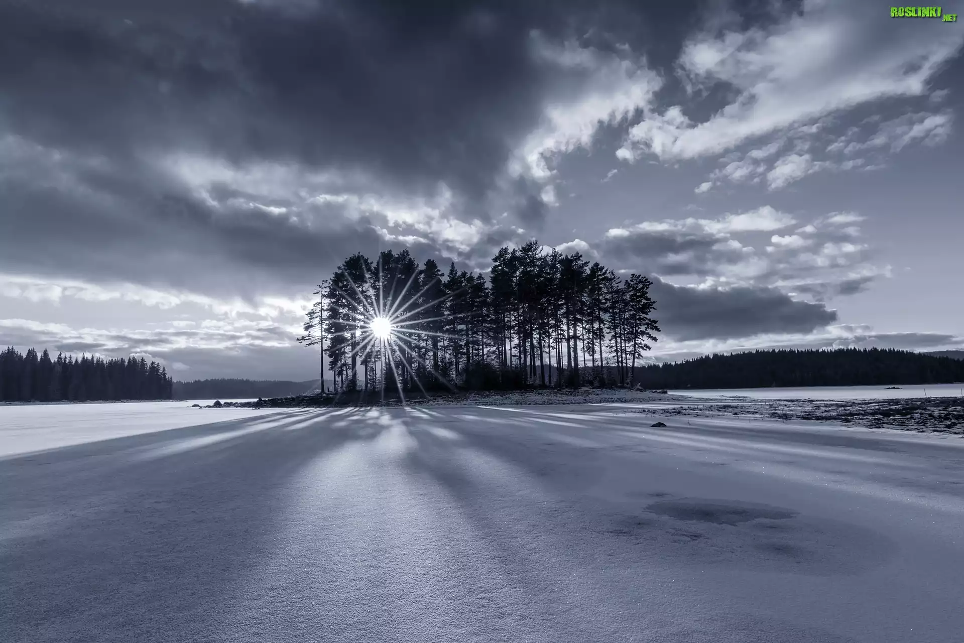 Rośliny: Zima, Promienie słońca, Drzewa, Chmury