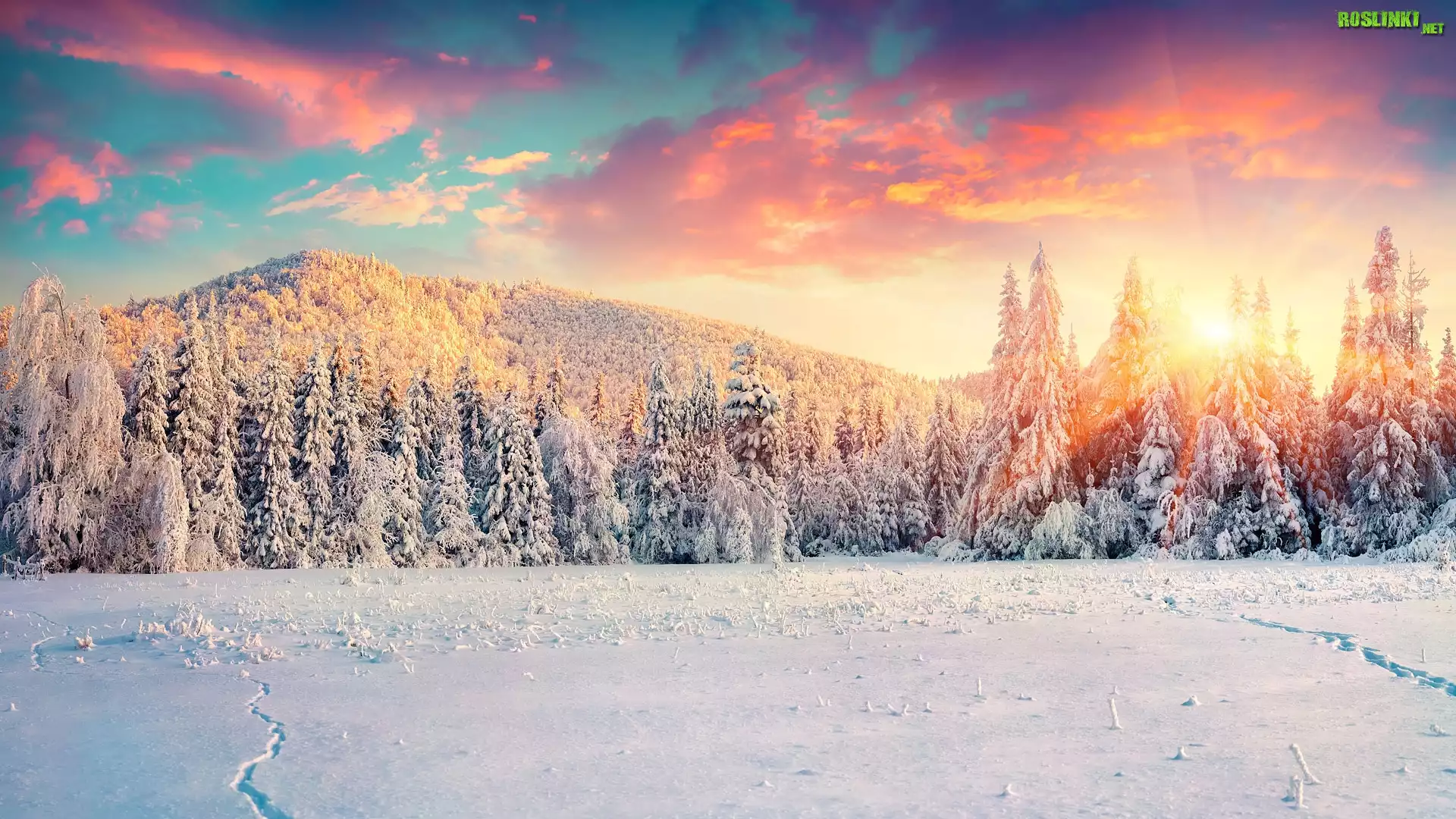Rośliny: Zima, Zachód słońca, Wzgórze, Drzewa, Las