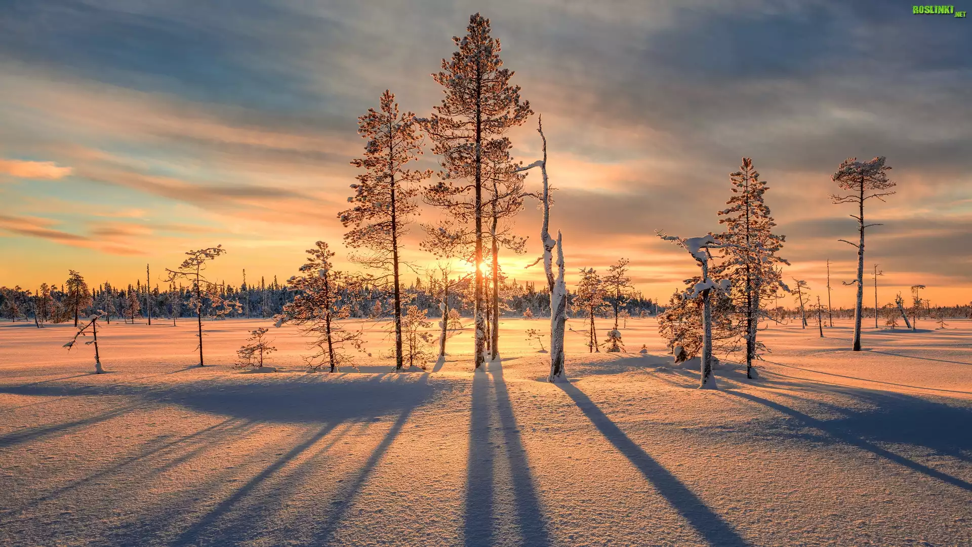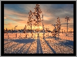Rośliny: Śnieg, Zima, Drzewa, Zachód słońca