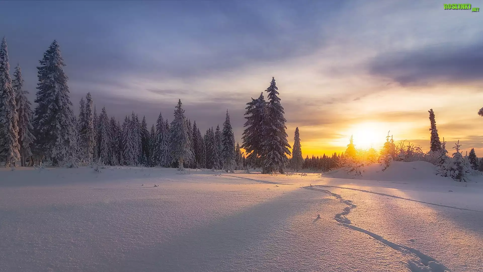 Rośliny: Zima, Śnieg, Wschód słońca, Drzewa, Ślady
