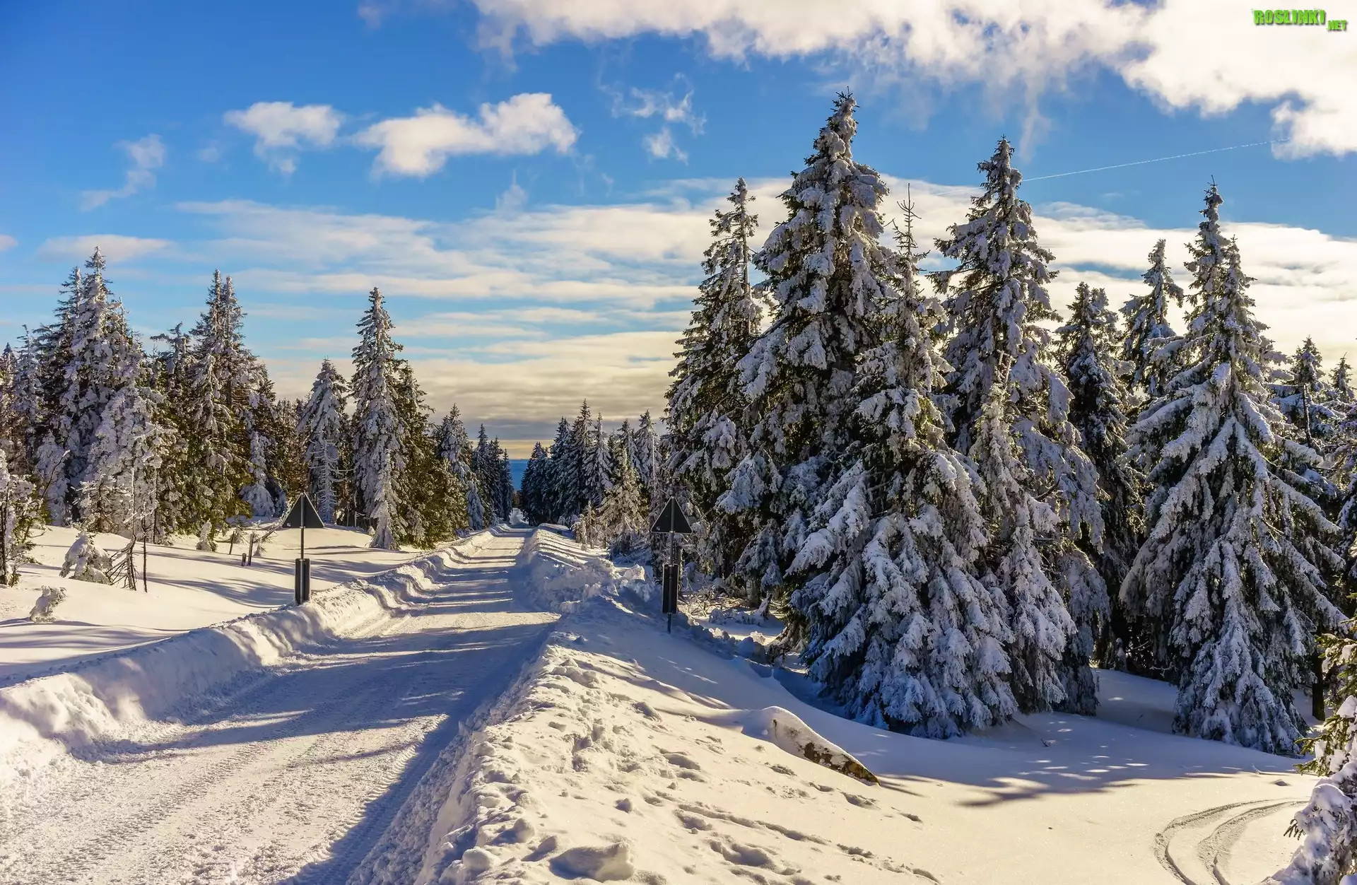 Rośliny: Zima, Droga, Znaki, Las, Drzewa, Świerki