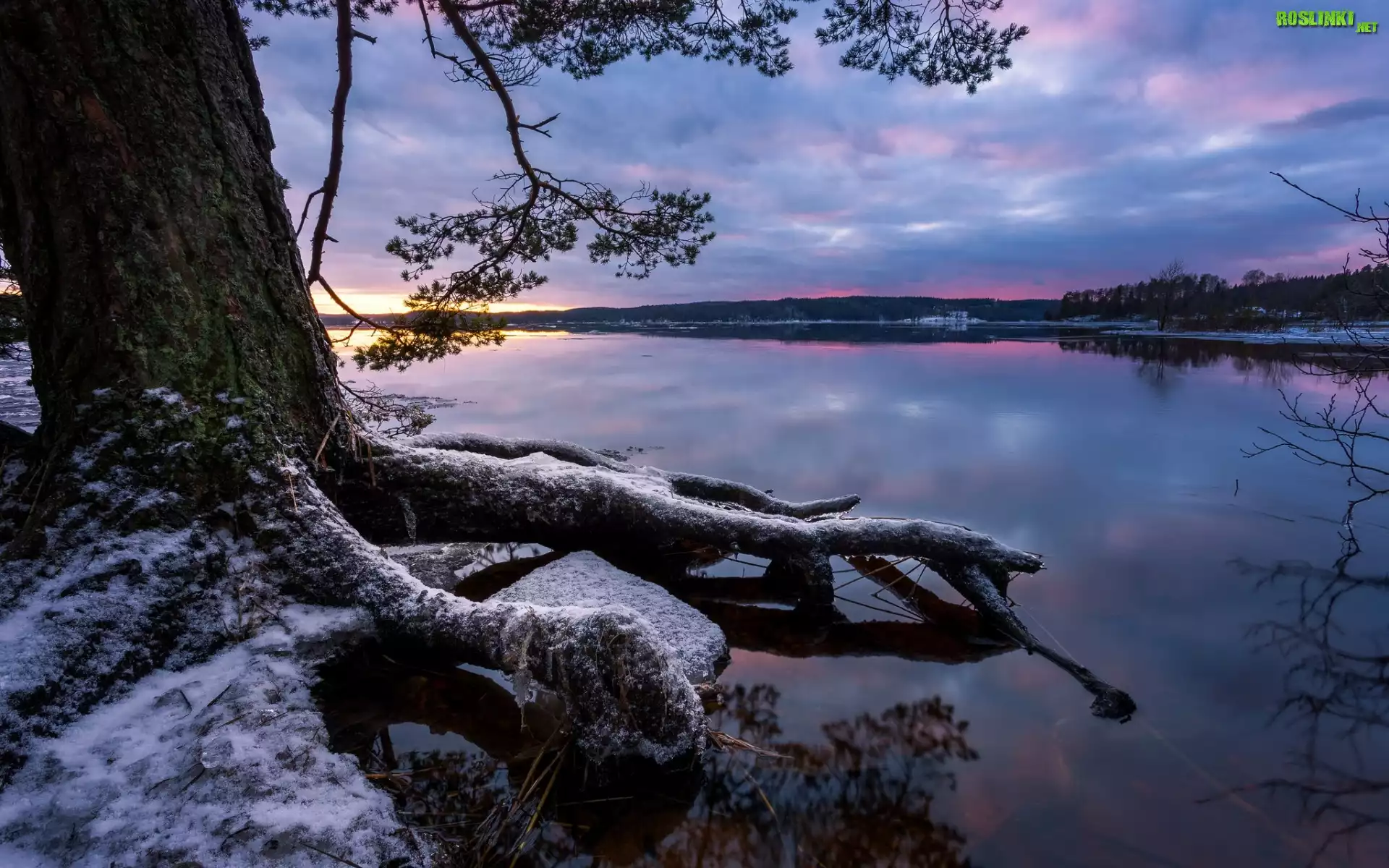 Zima, Jezioro, Wschód Słońca, Drzewo, Korzenie