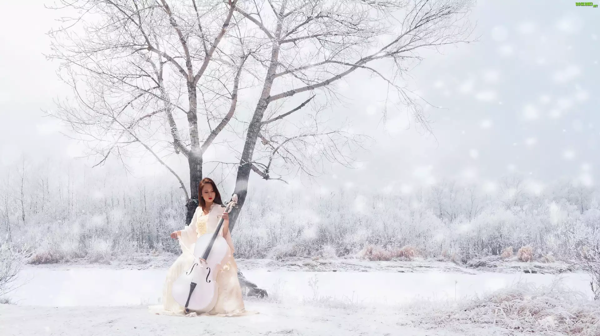 Rośliny: Zima, Śnieg, Las, Drzewo, Dziewczyna, Wiolonczela