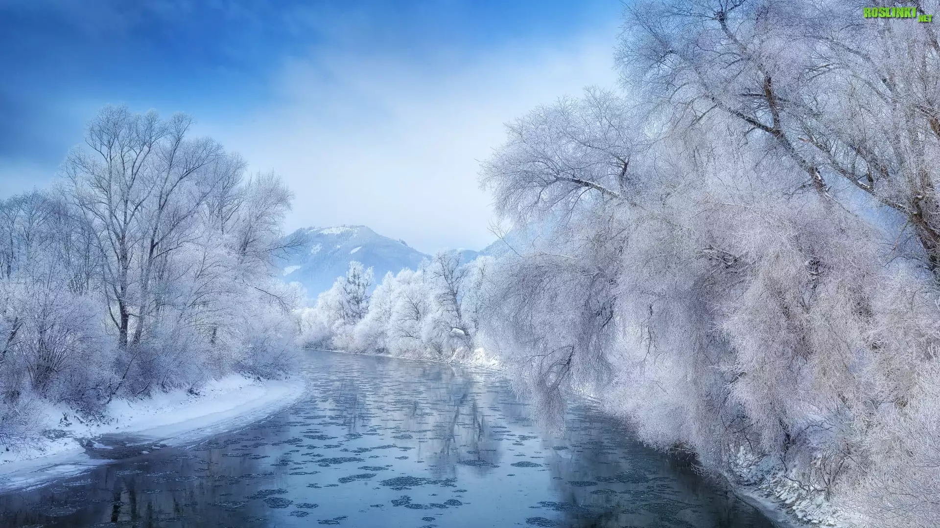 Rośliny: Zima, Śnieg, Rzeka, Las, Oszronione, Drzewa, Gałązki, Mgła, Góry