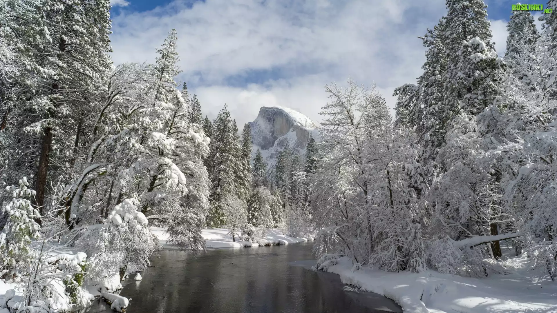 Rośliny: Zima, Rzeka, Drzewa, Śnieg, Góry, Niebo