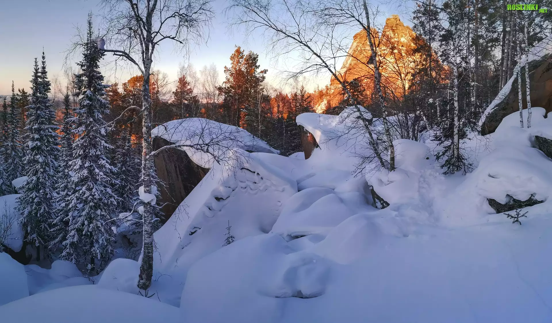 Rośliny: Zima, Śnieg, Drzewa, Góry, Skały