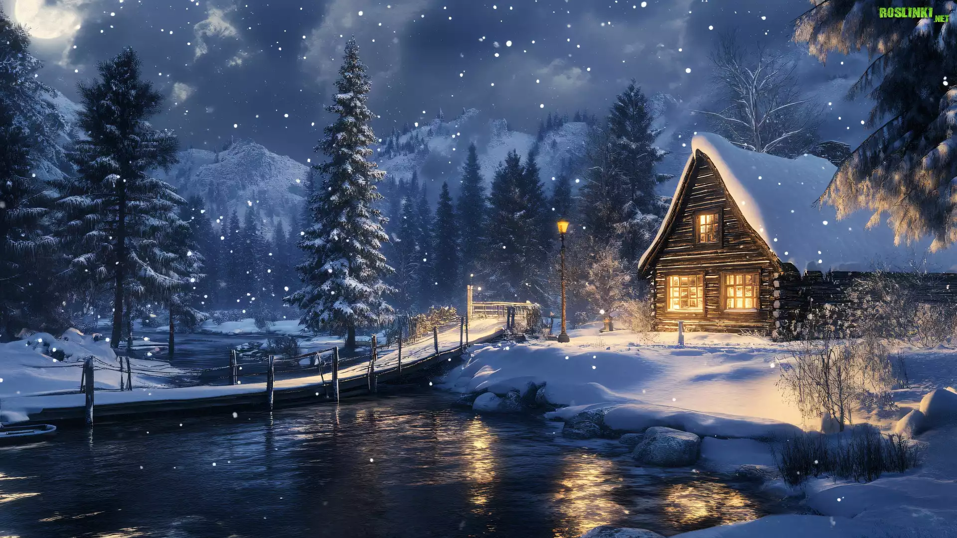 Rośliny: Zima, Dom, Latarnia, Rzeka, Most, Śnieg, Las, Drzewa, Góry, Noc