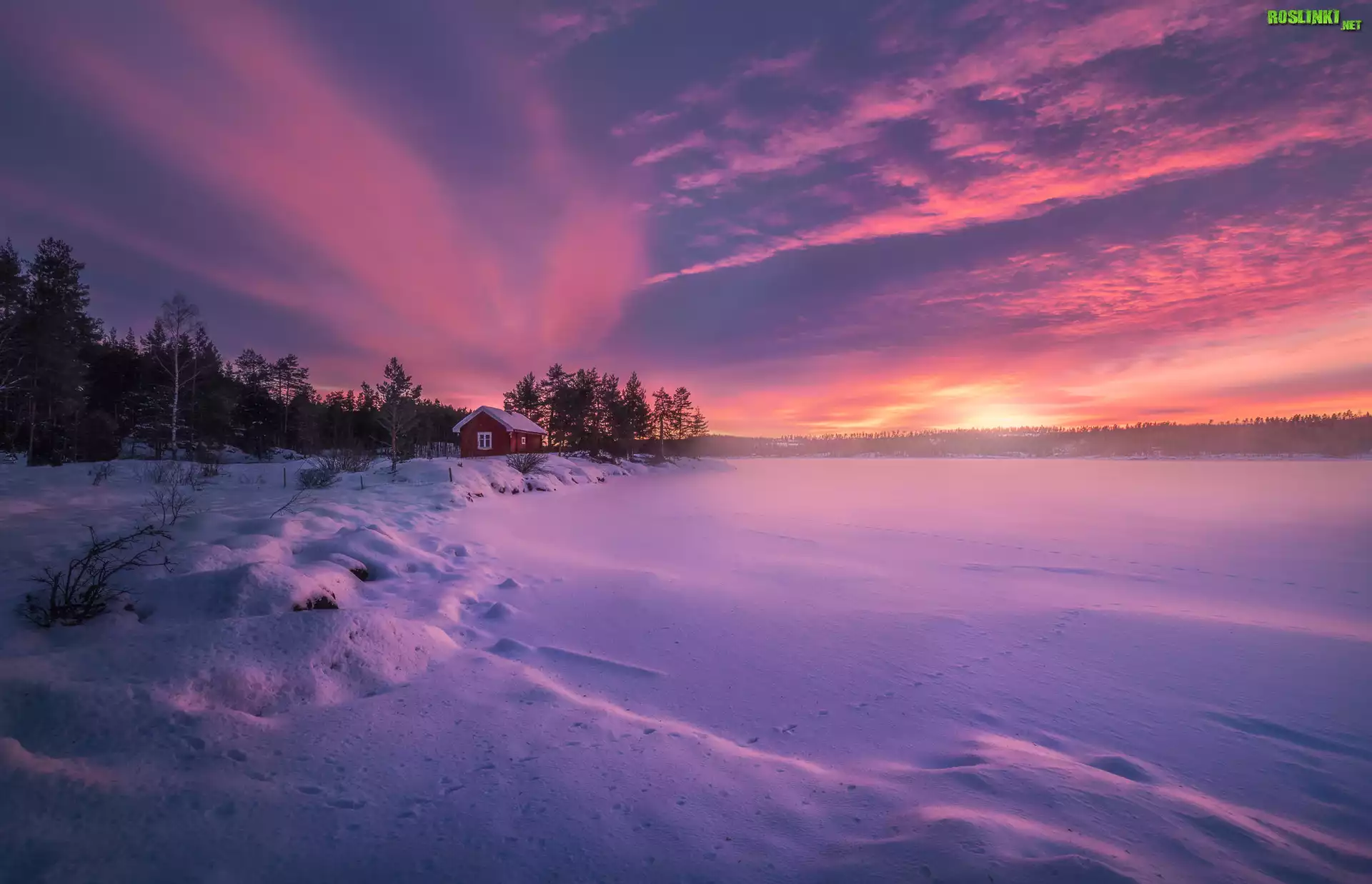 Rośliny: Norwegia, Ringerike, Jezioro, Drzewa, Dom, Chmury, Zachód słońca, Zima