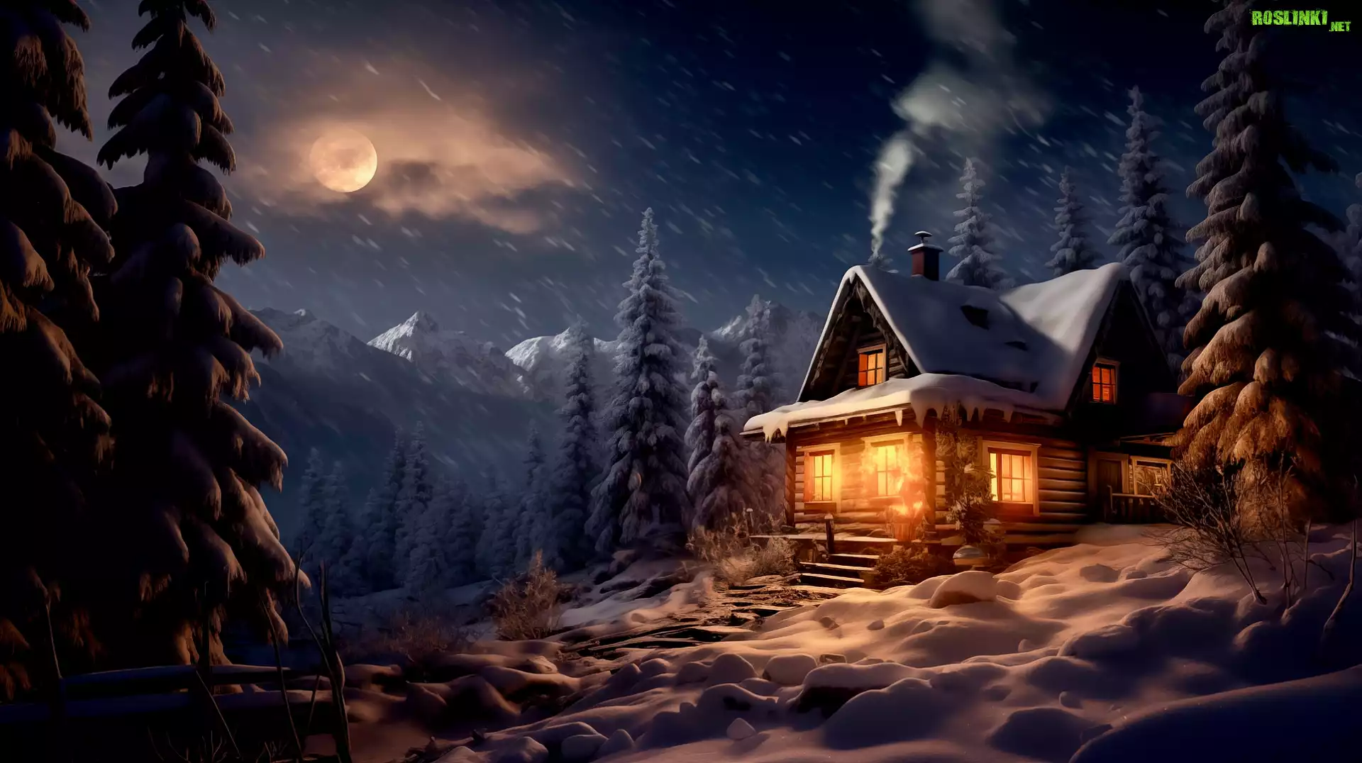 Rośliny: Zima, Dom, Oświetlony, Drzewa, Las, Noc, Księżyc, Śnieg, Grafika