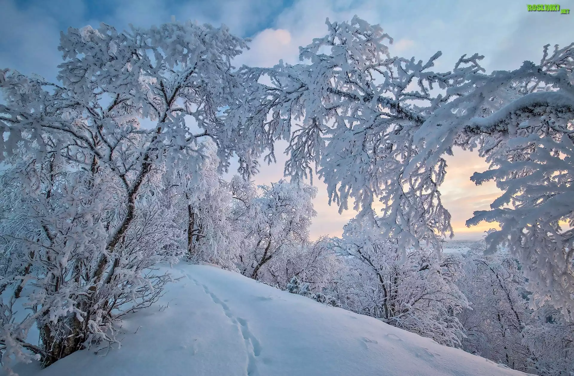 Rośliny: Zima, Ośnieżone, Drzewa, Ślady, Pagórek