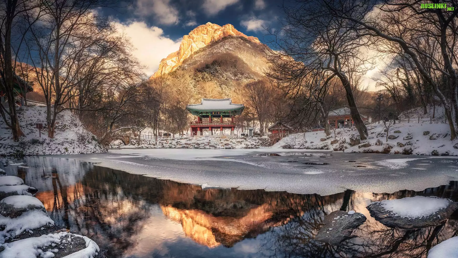 Park Narodowy Naejangsan, Świątynia Baekyangsa, Altana, Rzeka, Drzewa, Góry, Zima, Korea Południowa |