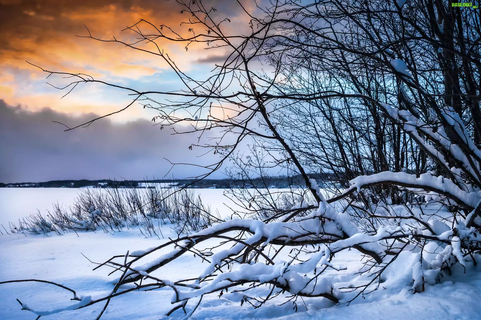 Rośliny: Zima, Drzewa, Pole, Gałęzie, Śnieg, Chmury, Niebo, Zachód słońca
