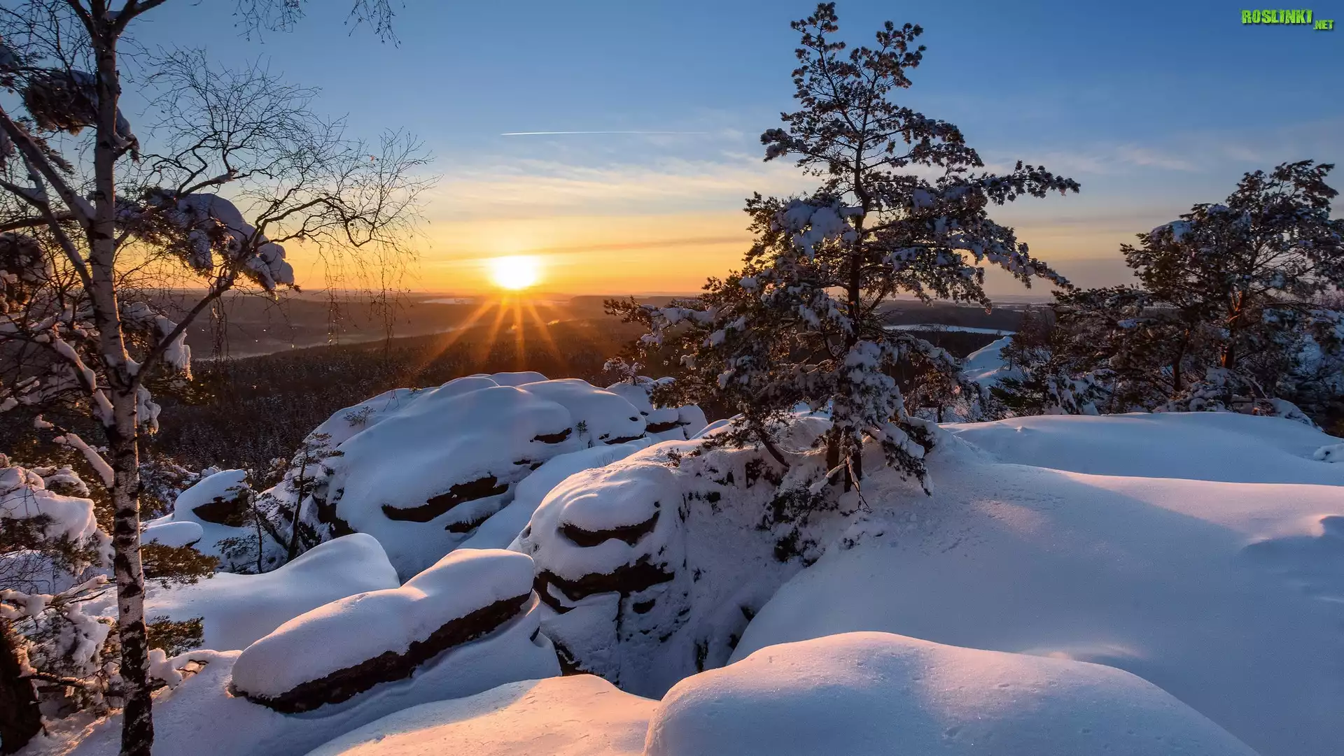 Rośliny: Zima, Zachód słońca, Góry, Śnieg, Drzewa