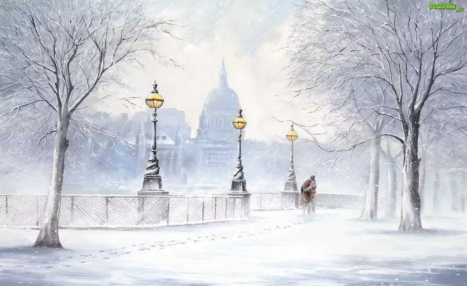 Obraz, Zima, Åšnieg, Zakochani, Drzewa, Zabytki, Lampy