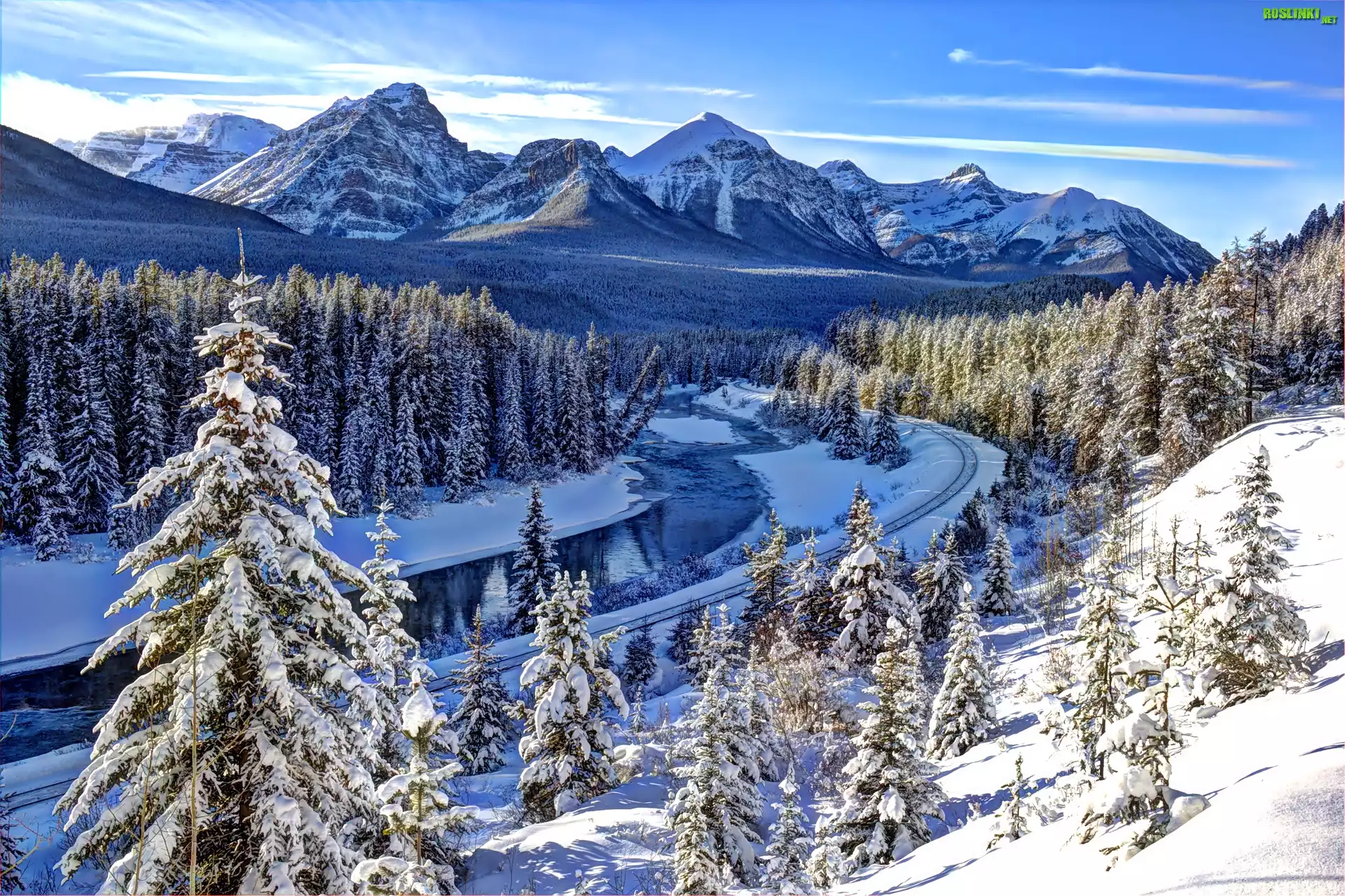Rośliny: Zima, Rzeka, Góry, Ośnieżone, Świerki