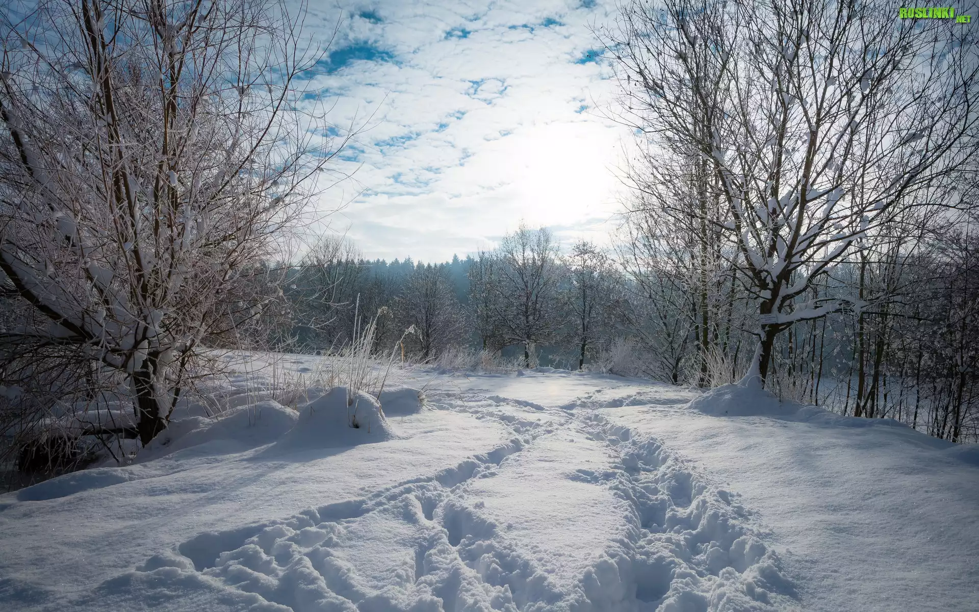 Zima, Śnieg, Ślady, Ośnieżone, Drzewa