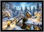 Zima, Rzeka, Most, Lampa, Dom, Las, Ośnieżone, Drzewa, Śnieg