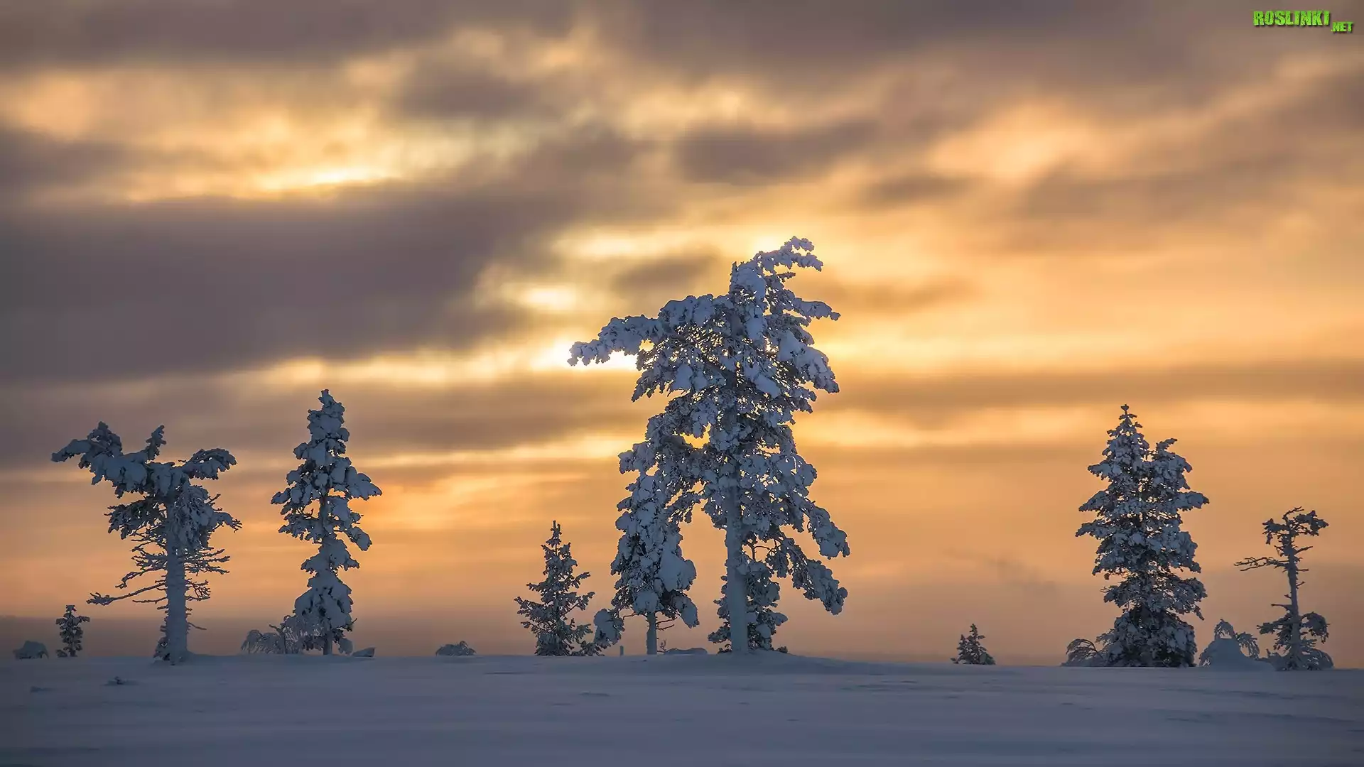 Rośliny: Zima, Zachód słońca, Ośnieżone, Drzewa