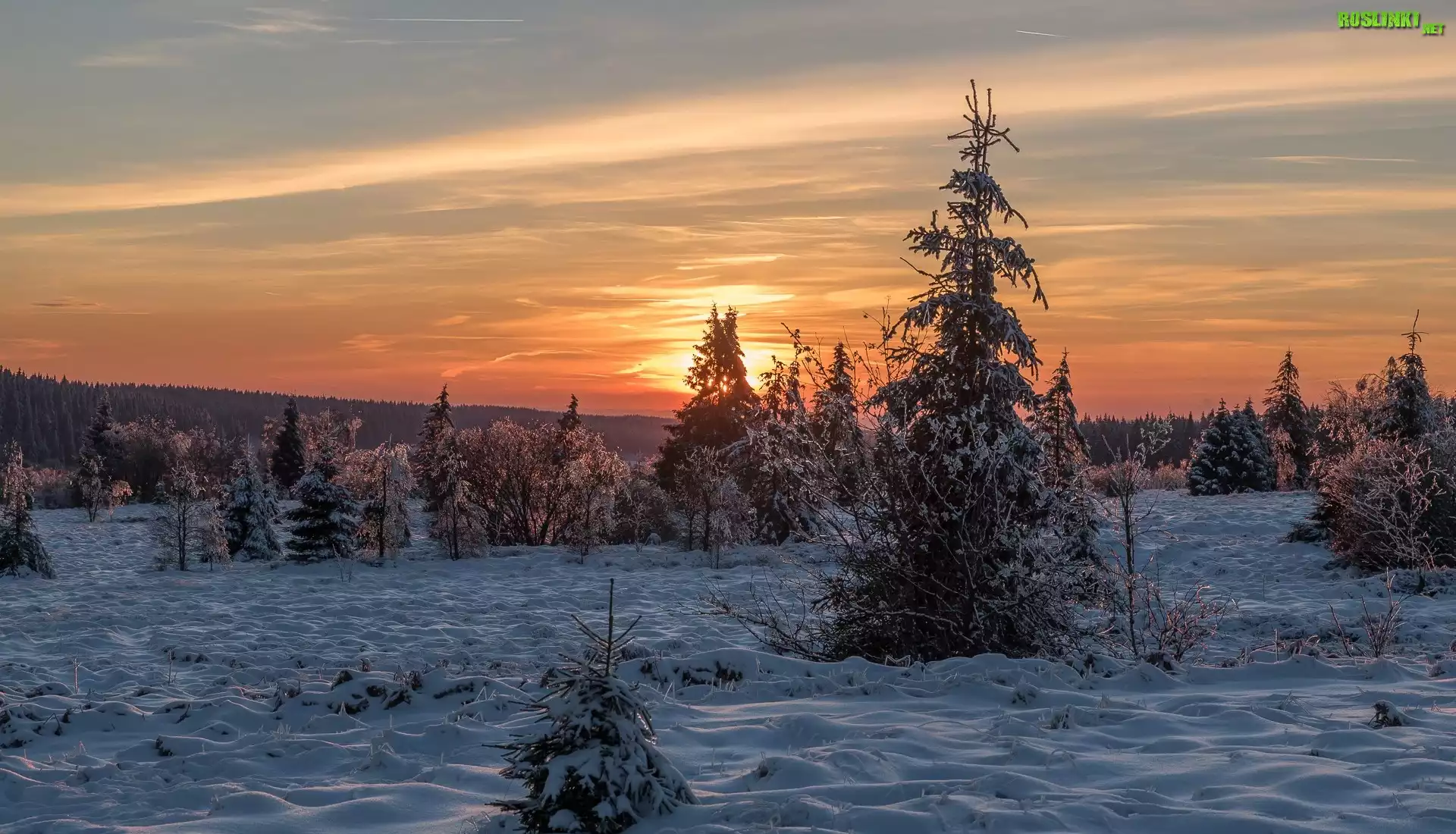 Rośliny: Zima, Zachód słońca, Ośnieżone, Świerki