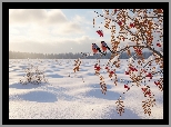 Zima, Dwa, Gile, Gałązki, Czerwone, Jarzębina, Owoce, Pole, Snieg