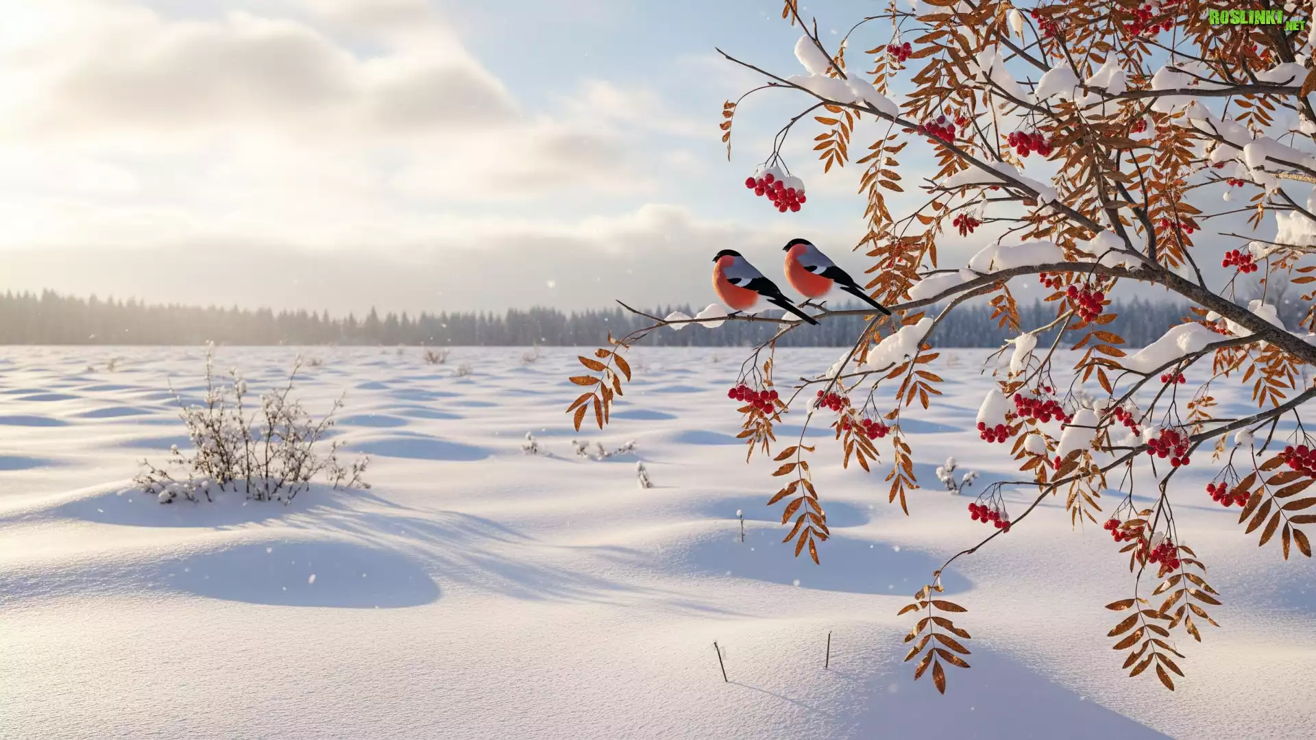 Rośliny: Zima, Dwa, Gile, Gałązki, Czerwone, Jarzębina, Owoce, Pole, Snieg