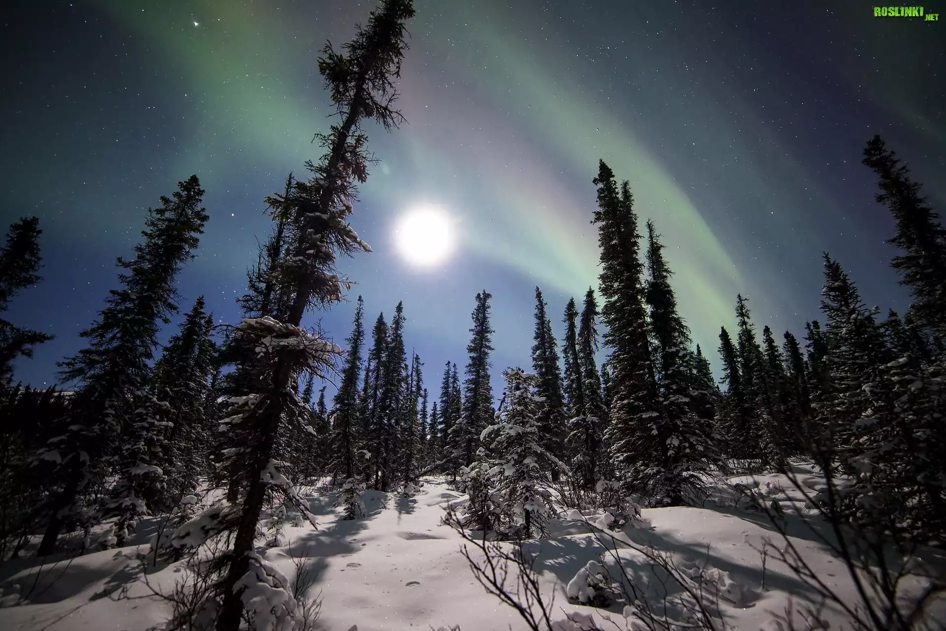 Zima, Wzgórza, Drzewa, Zorza, Polarna, Śnieg