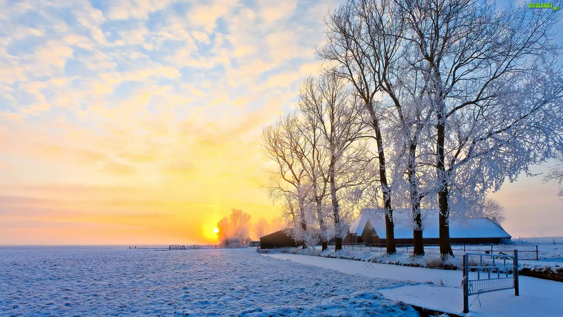 Rośliny: Zima, Wschód słońca, Pole, Drzewa
