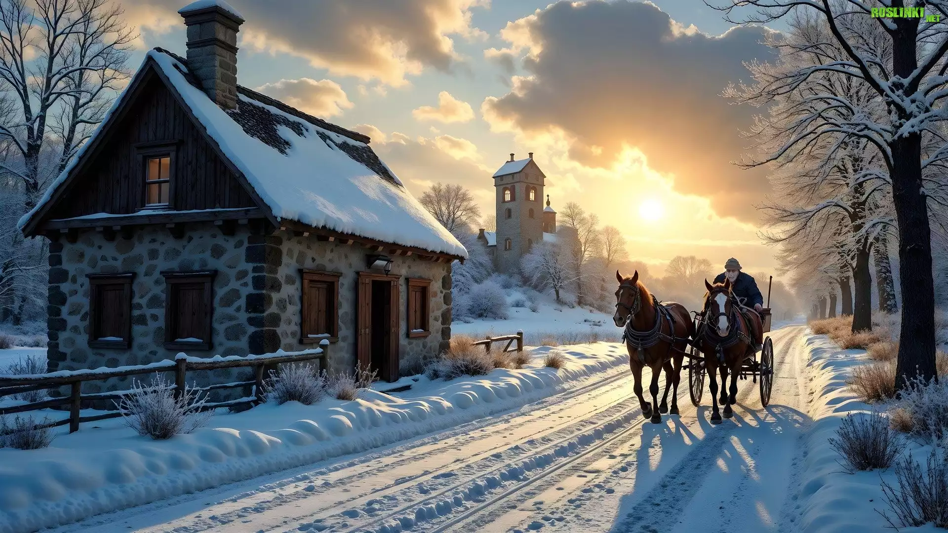 Rośliny: Zima, Dom, Droga, Drzewa, Konie, Bryczka, Powóz, Zachód słońca