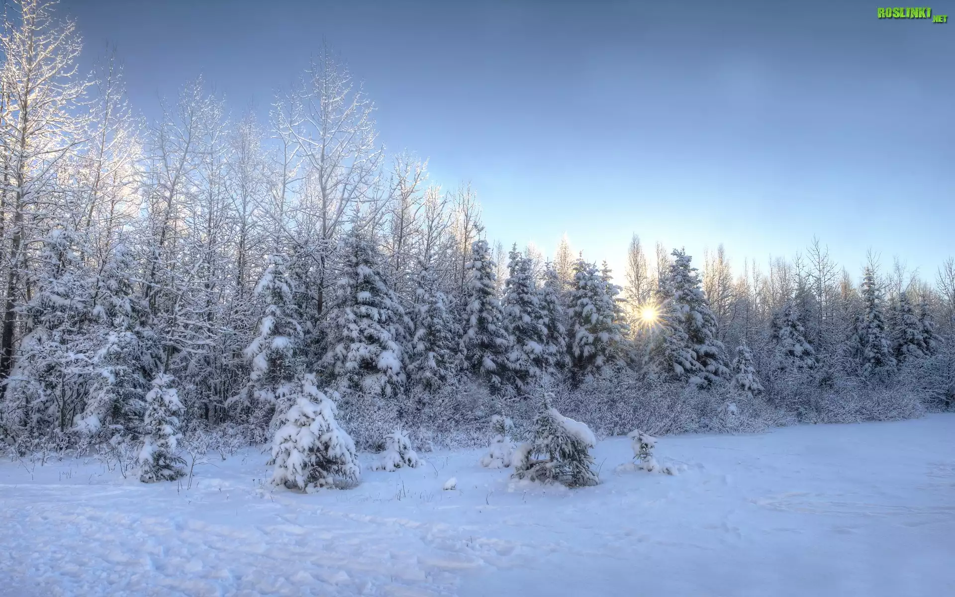 Rośliny: Zima, Las, Drzewa, Promienie słońca