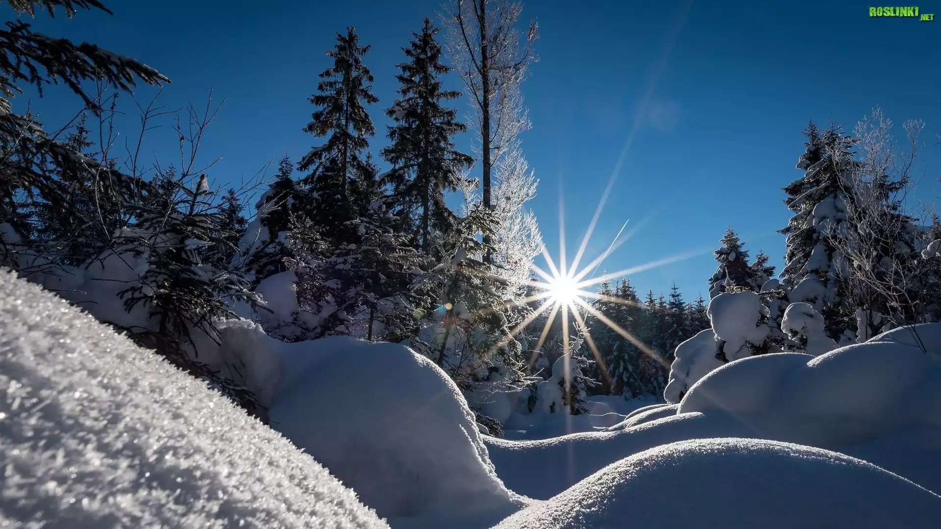 Rośliny: Zima, Drzewa, Śnieg, Promienie słońca