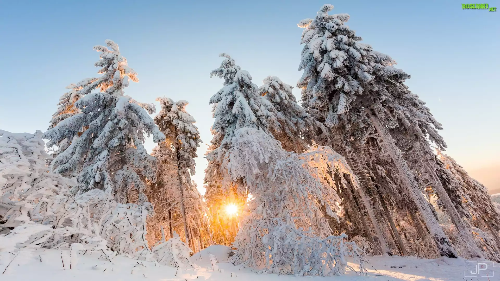 Rośliny: Zima, Las, Ośnieżone, Drzewa, Promienie słońca