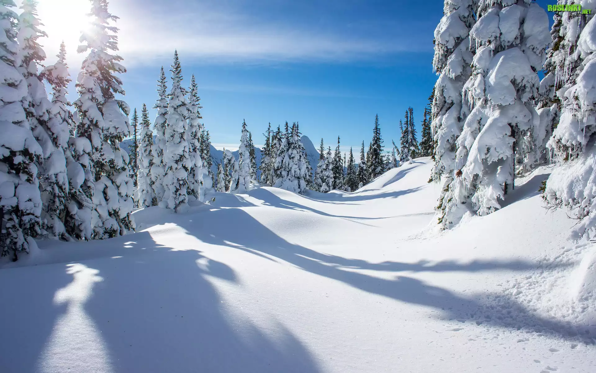 Rośliny: Zima, Ośnieżone, Świerki, Promienie słońca