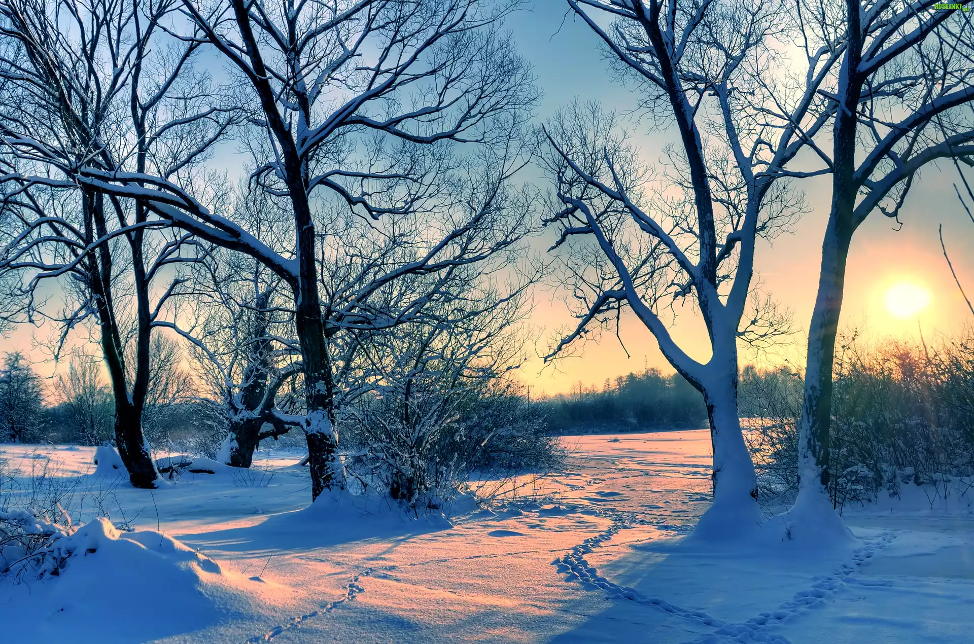 Rośliny: Zima, Drzewa, Przebijające, Słońce