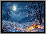 Zima, Księżyc, Śnieg, Ośnieżone, Drzewa, Pole, Rośliny, Zapalona, Laterenka