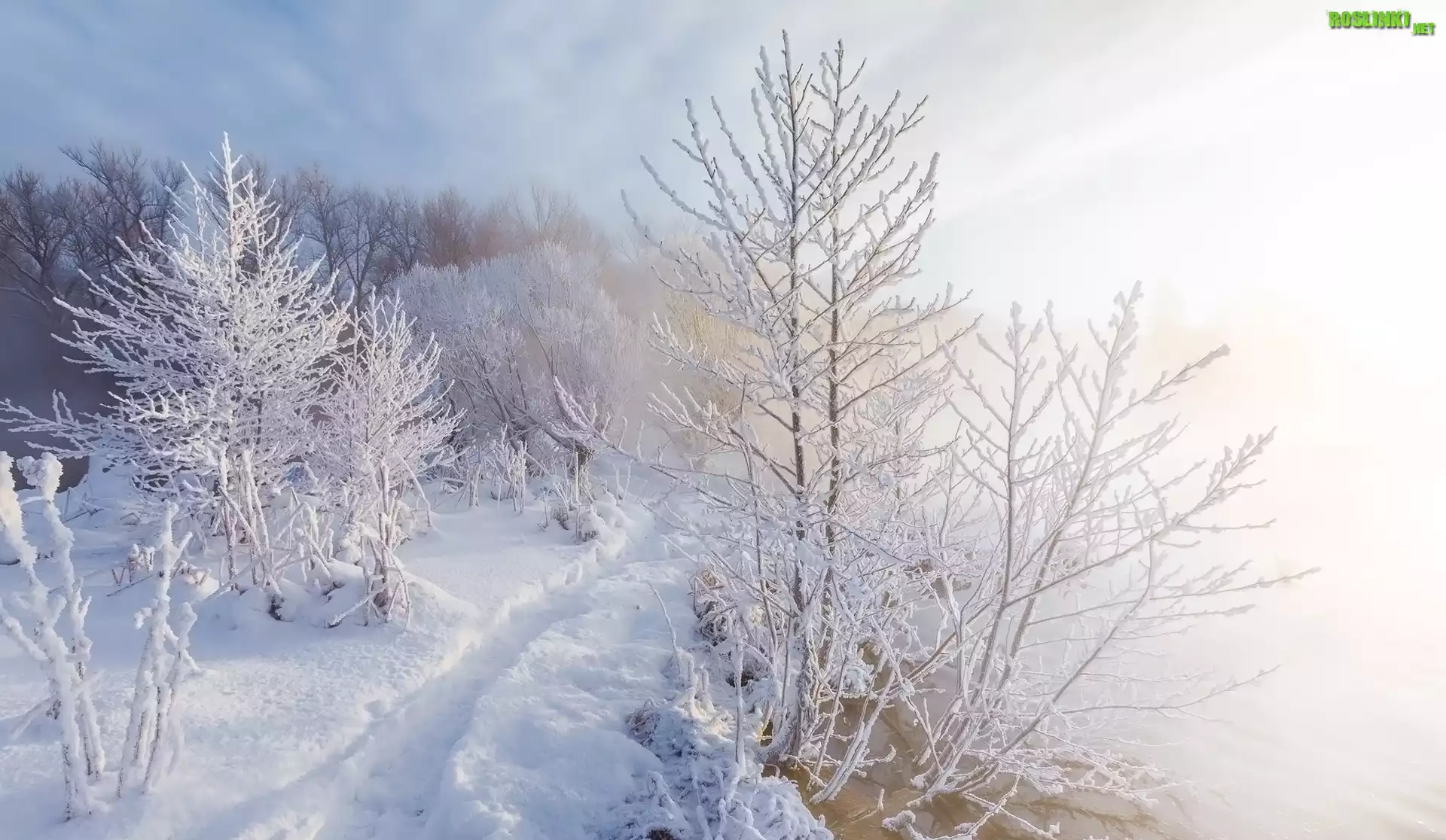 Rośliny: Zima, Drzewa, Dróżka, Rzeka, Mgła