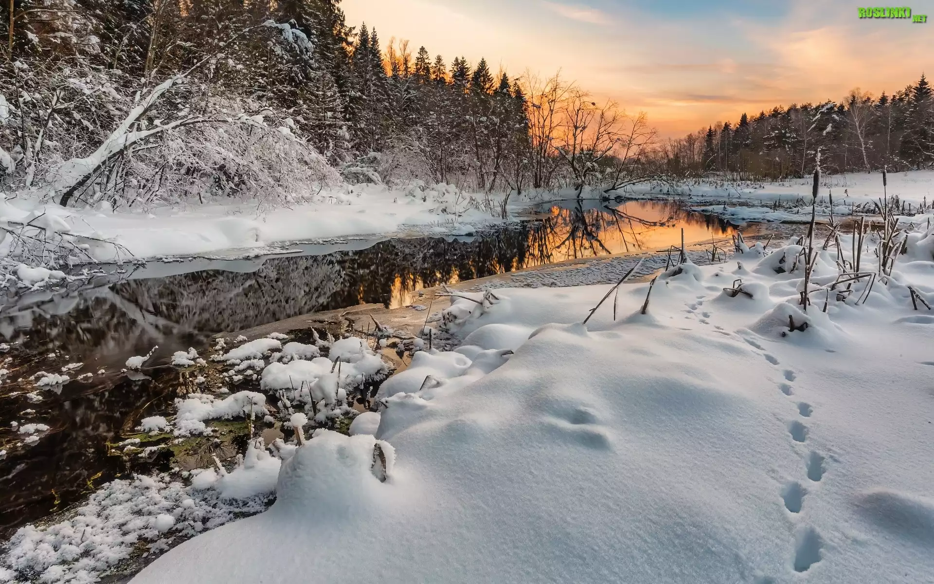 Rośliny: Rzeka, Zima, Śnieg, Ślady, Zachód słońca, Drzewa