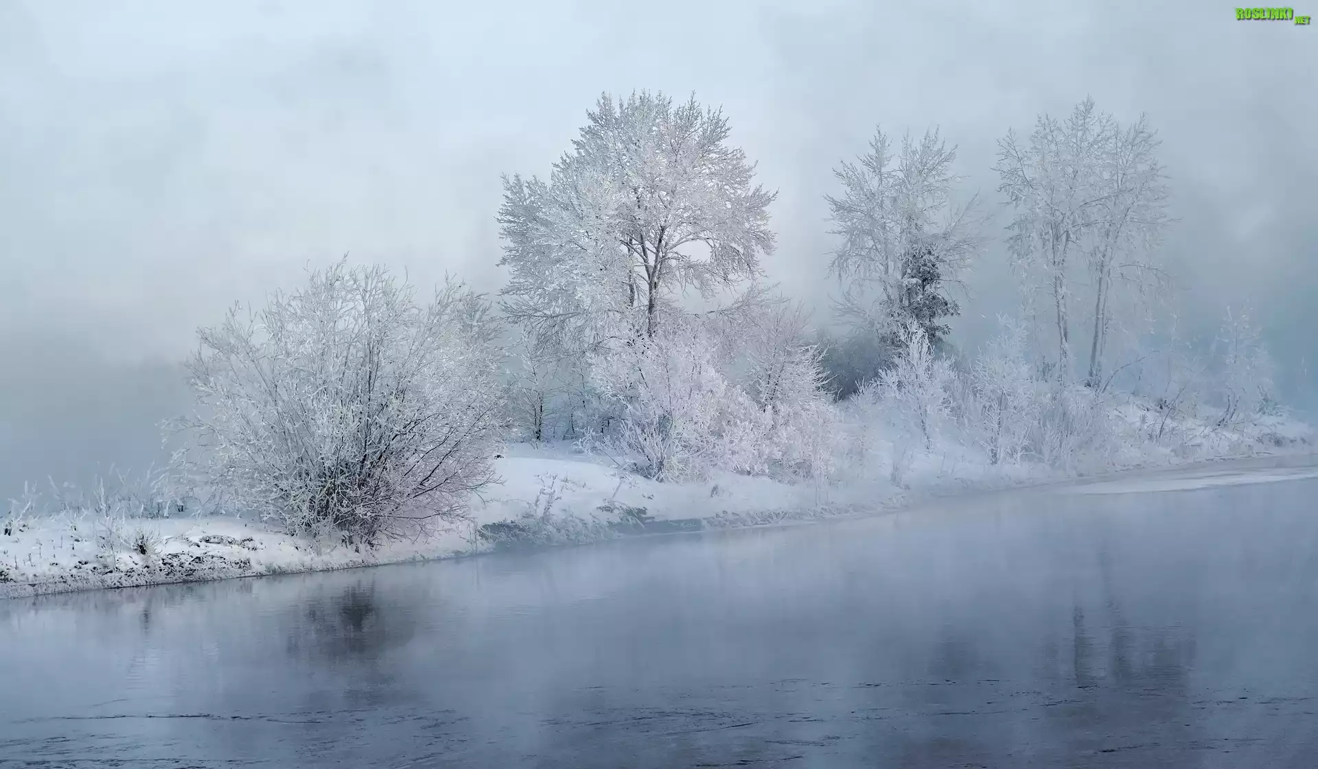 Rośliny: Zima, Oszronione, Krzewy, Drzewa, Rzeka, Mgła