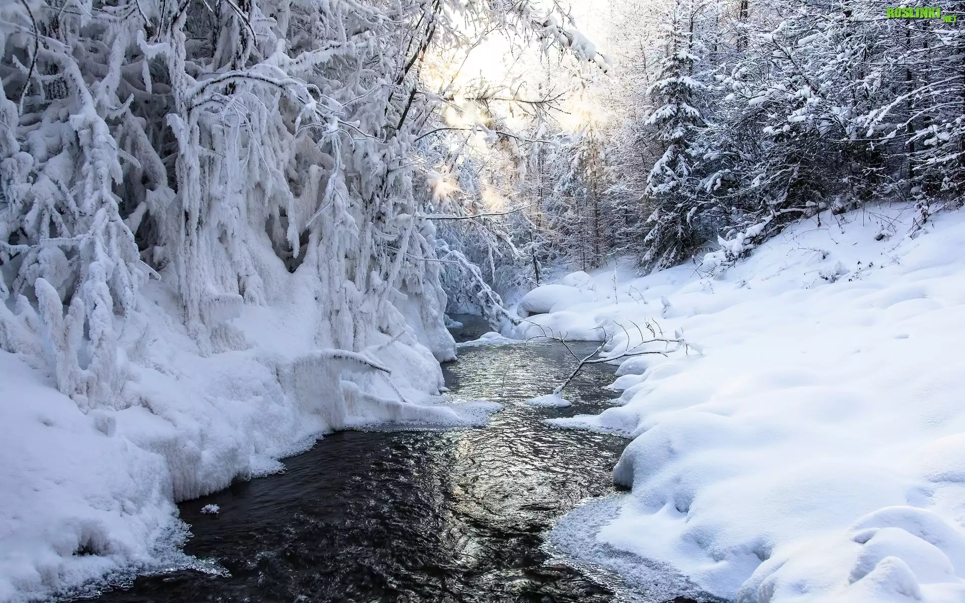 Rośliny: Zima, Drzewa, Śnieg, Rzeka, Lód