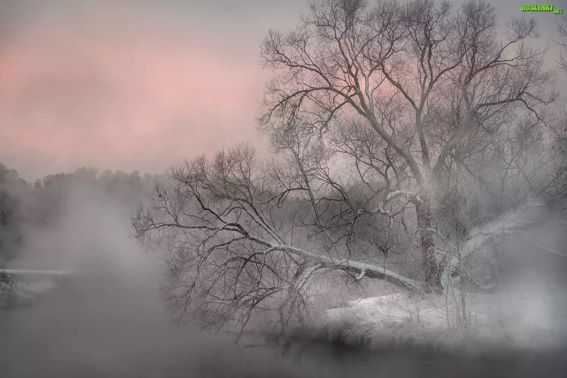 Rośliny: Zima, Drzewa, Pochylony, Konar, Rzeka, Mgła