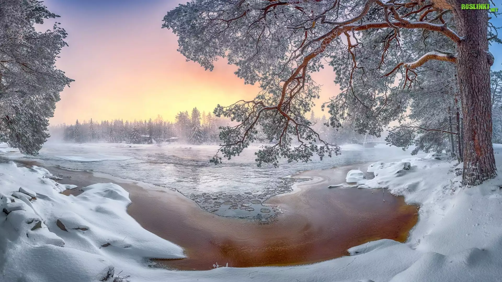 Rośliny: Zima, Zachód słońca, Rzeka, Drzewa