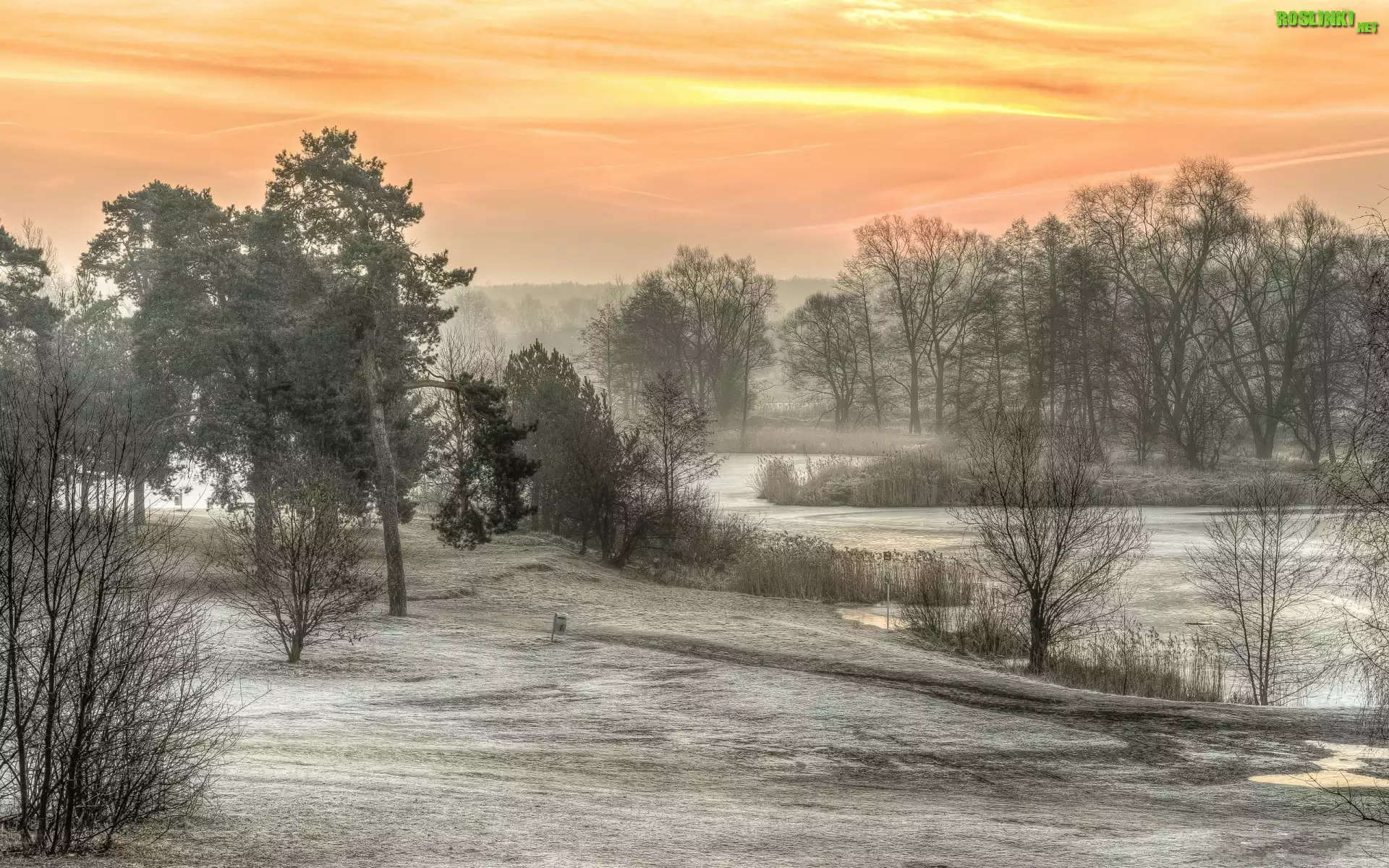 Rośliny: Zima, Drzewa, Szron, Śnieg, Rzeka, Poranek