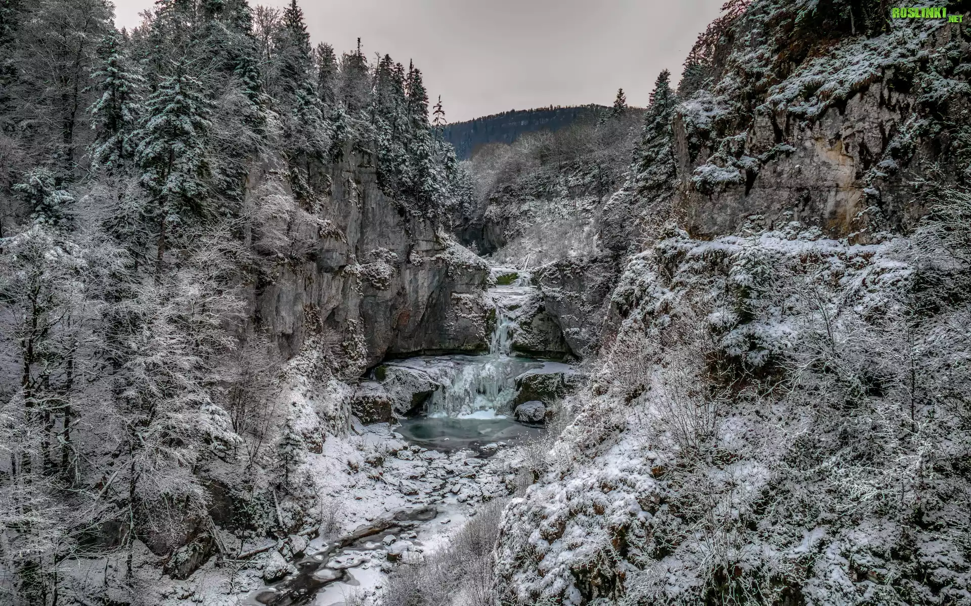 Rośliny: Zima, Wodospad, Skały, Drzewa