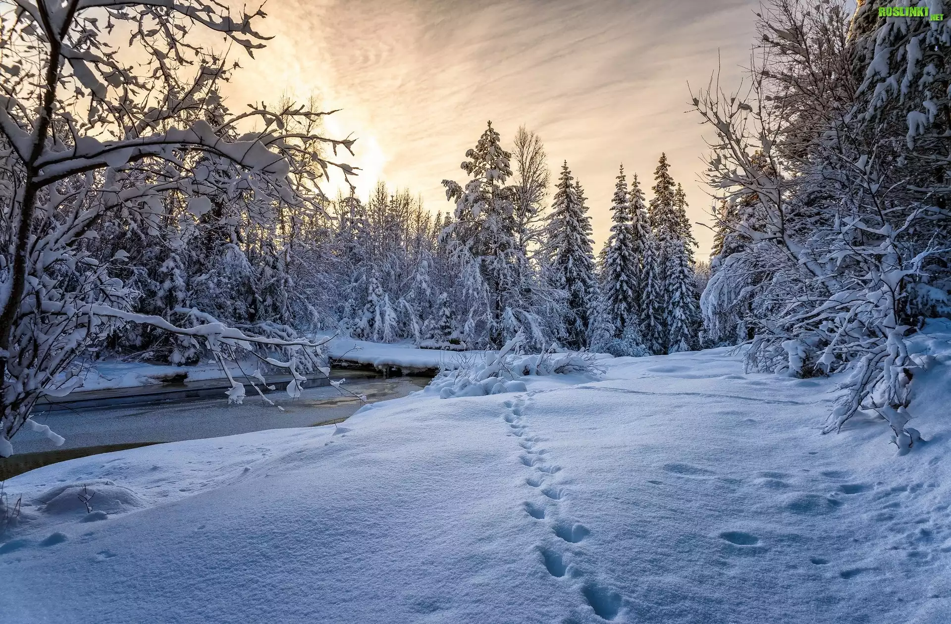 Rośliny: Zima, Rzeka, Drzewa, Wschód słońca, Śnieg