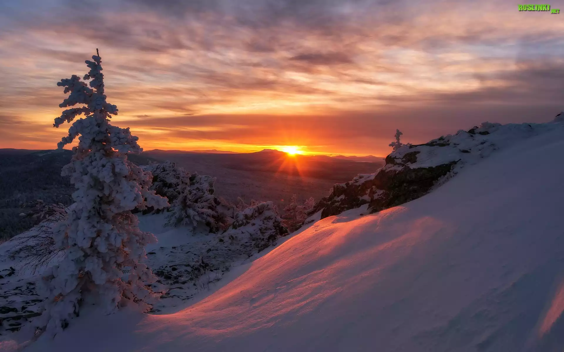 Rośliny: Zima, Góry, Drzewa, Zachód słońca, Chmury